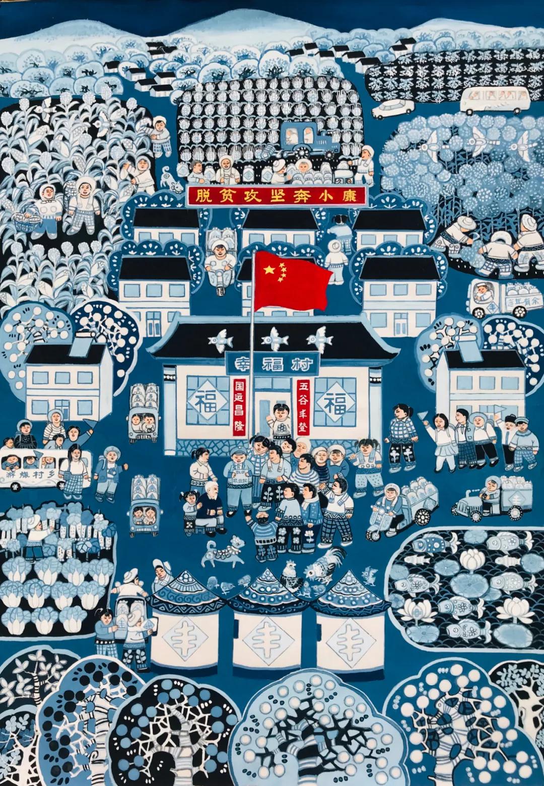 走進青州農民畫院,幸福感撲面而來。一幅幅構圖飽滿的農民畫,濃墨重彩地表現了熱火朝天的勞動現場、碩果累累的豐收景象、富足恬適的農家日常,生動形象地還原了新時代齊魯大地的鄉村生活。