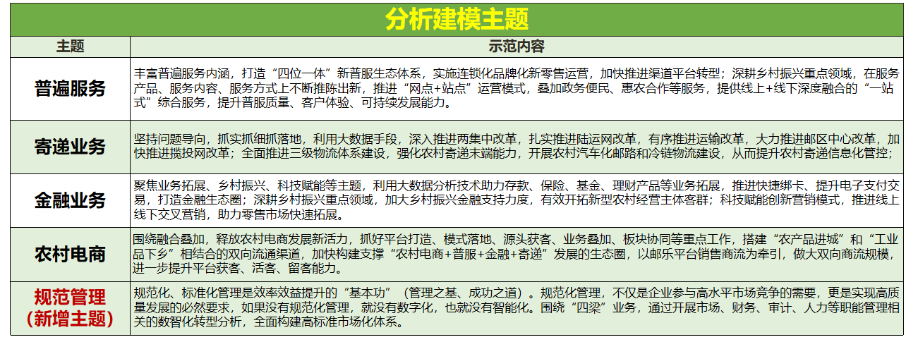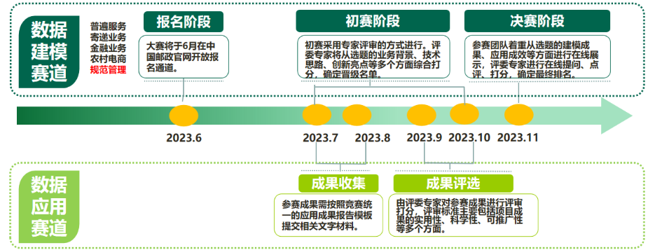 參賽團(tuán)隊(duì)可圍繞大賽指定的“普遍服務(wù)、寄遞業(yè)務(wù)、金融業(yè)務(wù)、農(nóng)村電商、規(guī)范管理”五大主題,結(jié)合業(yè)務(wù)實(shí)際需求,開展分析建模及拓展,并通過ppt、線上答辯方式介紹方案思路及建模流程。