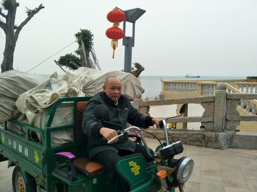 謝堅將剛剛下船的包裹運送回郵政所