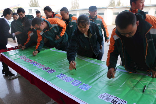 10月19日,內蒙古自治區阿拉善盟郵政分公司黨委、工會和團委聯合開展了“綠色郵政建設行動”暨“安全文明出行”倡議活動,共計100余人參加此次活動。在現場,阿拉善盟分公司宣讀了《綠色郵政 綠色發展 郵我先行倡議書》《阿拉善盟郵政分公司車輛綠色安全文明出行承諾書》,還組織了“綠色郵政建設和安全文明出行”簽字儀式和廢舊包裝箱回收活動。阿拉善盟分公司通過對外推廣+對內踐行的方式,積極開展綠色包裝、綠色宣傳、綠色運行、綠色經營等活動,讓綠色發展理念深植企業,力爭通過3年時間讓阿拉善盟分公司形成人人爭做“綠色運營踐行者,綠色生活推動者,綠色生態守護者,綠色品牌塑造者”的良好風尚。 □巴根 攝影報道