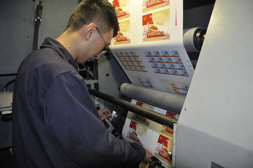 11月29日得知郵票圖稿通過審查即將下廠的消息,制作團隊拿出早已提前準備好的生產方案,但是擺在眼前的就是嚴重不足的生產和發運周期,按常規生產必定不能滿足發行要求。各生產環節的負責人齊刷刷坐在會議室里研究,一個又一個方案都被否決,必須突破常規,從哪里著手?一個提議逐漸獲得越來越多人認可:將版式一、版式二、小型張三個品種同時刻在一個滾筒上,同時調圖刻版、打樣批樣,在后期按生產比例再加刻版式一、小型張滾筒補印,最大限度節省重復刻版和打樣時間。后加工能適應這種方式嗎?印制團隊眼中閃著疑惑和思考,最終變成肯定。行,就這么干!