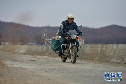 在琿春市春化鎮,金仁哲騎著摩托車在送郵件的路上。