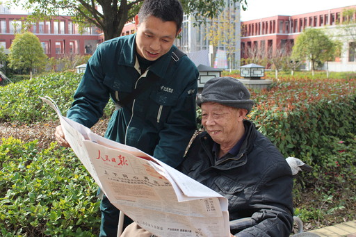 3月15日,湖北省十堰市郵政分公司三堰投遞站投遞員汪新海將當天的《人民日報》送到訂戶莫大爺手中,使其可以及時了解兩會最新消息。