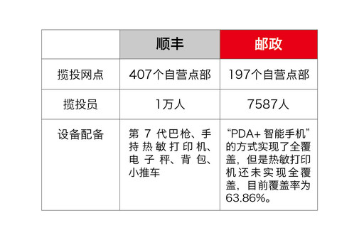 不只在網(wǎng)運(yùn)方面,郵政在攬收、投遞等環(huán)節(jié)上與競(jìng)爭(zhēng)對(duì)手也存在差距。從攬收能力上來(lái)說(shuō),以河北為例,順豐有攬投網(wǎng)點(diǎn)407個(gè),郵政寄遞事業(yè)部有269個(gè);順豐有一線攬投員1萬(wàn)人,寄遞事業(yè)部有7587人。在設(shè)備配備方面,順豐配有第7代巴槍、手持熱敏打印機(jī)、電子秤、背包、小推車(chē);河北郵政通過(guò)“PDA+智能手機(jī)”的方式實(shí)現(xiàn)了全覆蓋,但是熱敏打印機(jī)還未實(shí)現(xiàn)全覆蓋,目前覆蓋率為63.86%。(見(jiàn)圖表2)