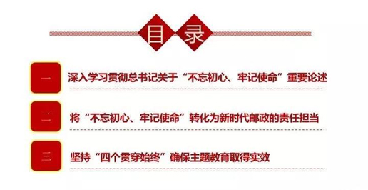 在郵政全系統(tǒng)按照中央要求扎實(shí)推進(jìn)“不忘初心、牢記使命”主題教育之際,中國(guó)郵政集團(tuán)公司黨組于6月25日至30日在郵政黨校北京校區(qū)舉辦主題教育集中學(xué)習(xí)研討。25日下午,黨組書記、董事長(zhǎng)劉愛力從深入學(xué)習(xí)貫徹習(xí)近平總書記關(guān)于“不忘初心、牢記使命”重要論述,將“不忘初心、牢記使命”轉(zhuǎn)化為新時(shí)代郵政的責(zé)任擔(dān)當(dāng),堅(jiān)持“四個(gè)貫穿始終”確保主題教育取得實(shí)效三個(gè)方面講授專題黨課。