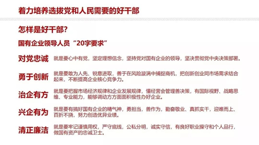 在全國(guó)國(guó)有企業(yè)黨的建設(shè)工作會(huì)議上,習(xí)近平總書記對(duì)國(guó)有企業(yè)領(lǐng)導(dǎo)人員提出了對(duì)黨忠誠(chéng)、勇于創(chuàng)新、治企有方、興企有為、清正廉潔的“20字要求”。劉愛力在領(lǐng)學(xué)時(shí)表示,中國(guó)郵政將習(xí)近平總書記對(duì)國(guó)有企業(yè)領(lǐng)導(dǎo)人員的“20字要求”作為選拔干部、培養(yǎng)干部、考核干部的根本遵循,嚴(yán)格貫徹執(zhí)行《黨政領(lǐng)導(dǎo)干部選拔任用工作條例》,堅(jiān)持好干部標(biāo)準(zhǔn),把政治標(biāo)準(zhǔn)放在第一位。