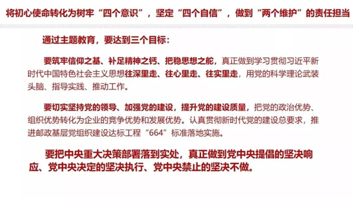 不忘初心再出發(fā),牢記使命勇?lián)?dāng)。在舉國(guó)上下喜迎新中國(guó)成立70周年之際,集團(tuán)公司黨組按照中央部署,以上率下,團(tuán)結(jié)帶領(lǐng)各級(jí)黨組織和廣大黨員干部,樹牢“四個(gè)意識(shí)”、堅(jiān)定“四個(gè)自信”、做到“兩個(gè)維護(hù)”,切實(shí)增強(qiáng)政治自覺、思想自覺、行動(dòng)自覺,有力有序有效推進(jìn)主題教育深入開展,將初心使命轉(zhuǎn)化為新時(shí)代郵政的責(zé)任擔(dān)當(dāng),做到學(xué)思用貫通、知信行統(tǒng)一,確保主題教育取得扎扎實(shí)實(shí)的成效,以主題教育的成效推動(dòng)郵政改革發(fā)展、創(chuàng)新轉(zhuǎn)型取得新突破、邁上新臺(tái)階。
