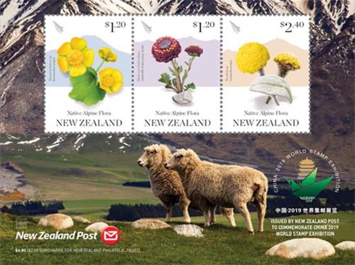 新西蘭于6月11日發行“中國2019世界集郵展覽”郵票小全張,郵票圖案為“新西蘭高山植物”,小全張邊飾以新西蘭風景配上新西蘭郵政標識和此次世界郵展標識(圖2)。