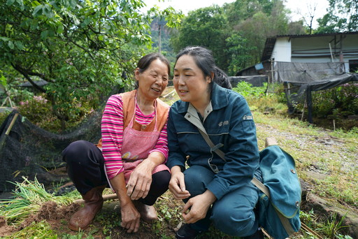 在美麗的石斛花田中,孫茂梅向種植戶了解藥效和石斛的長勢。