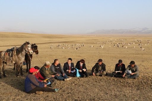郵儲銀行工作人員在巴音布魯克草原上做業務宣傳。