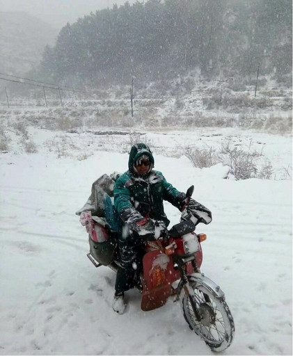 10多年前的孟山鄉(xiāng),條件十分艱苦,環(huán)境十分惡劣。那時的孟山鄉(xiāng)一帶鮮有橋梁,每次暴雨時節(jié),郭成明為了不讓用戶的郵件受到損失,每次過河前都將郵件用塑料包好,冒著大雨往返河流15次,將郵件完好無損地交到收件人手中。雖說每次都是有驚無險,但長途的跋涉“危險”也常伴左右,記得那是2010年冬天的一個傍晚,天色漸暗,他送完最后一個郵件想趁著天還沒有全黑趕回家中,可就在出村不遠(yuǎn)的一條羊腸小道上,前方突然出現(xiàn)大片暗冰。他急踩剎車后,摩托車朝著路邊深溝沖了過去。他急忙握緊車把調(diào)轉(zhuǎn)方向,卻又撞向了路邊的山崖,重重地將他摔在了地上。這一次的經(jīng)歷造成了郭成明腿部靜脈曲張、腰椎間盤突出的傷痛,可他仍然堅持在這條郵路上跋涉,從來沒有抱怨過。