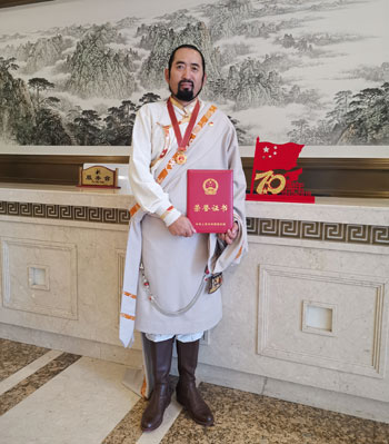 四川省甘孜藏族自治州甘孜縣郵政分公司長途郵運駕駛員其美多吉榮獲全國民族團結進步模范個人稱號,習近平總書記親自為其美多吉頒發獎章和證書。