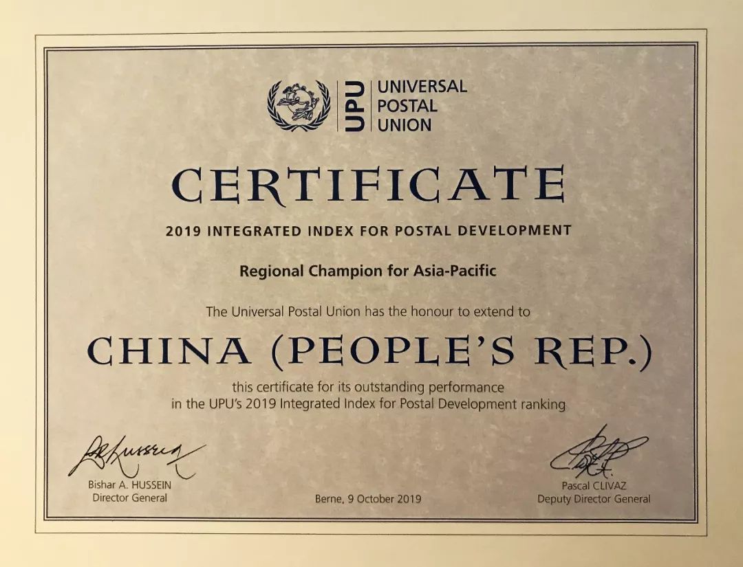 中國郵政榮獲2019年萬國郵聯(lián)郵政發(fā)展綜合指數(shù)亞太區(qū)冠軍
