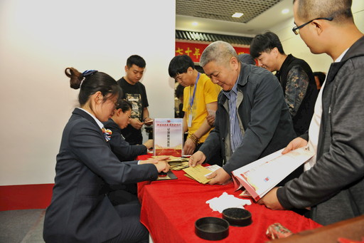 9月25日,“壯麗七十年 闊步新時代”慶祝新中國成立70周年全國集郵文化活動(太原站)暨山西省第十一屆集郵展覽拉開帷幕。此次郵展為全省綜合性郵展,規(guī)模為286框。持續(xù)三天的展覽,展出了以新中國成立70年來在政治、經(jīng)濟、文化、軍事等領(lǐng)域取得的偉大成就為主題的郵集,展品內(nèi)容豐富多彩。圖為郵政工作人員特別提供紀念戳加蓋服務。 □山西記者 裴效華 攝影報道