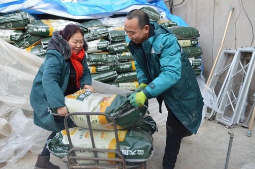 苗永強夫妻倆幫農(nóng)戶轉(zhuǎn)運郵政分銷化肥。