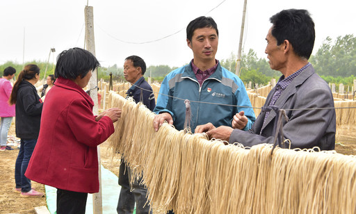 江蘇省豐縣郵政分公司王溝鎮鄉郵員趙本增熱心幫助當地百姓脫貧致富。圖為10月12日,趙本增途經粉條晾曬基地,主動提議用自己的“農民致富微信朋友圈”發信息幫經營業主賣粉條。 □卜慶海  劉立明  攝影報道