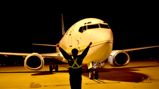11月11日凌晨,中國(guó)郵政航空公司南京分公司機(jī)務(wù)人員正在引導(dǎo)飛機(jī)入位。□劉立明 攝影報(bào)道