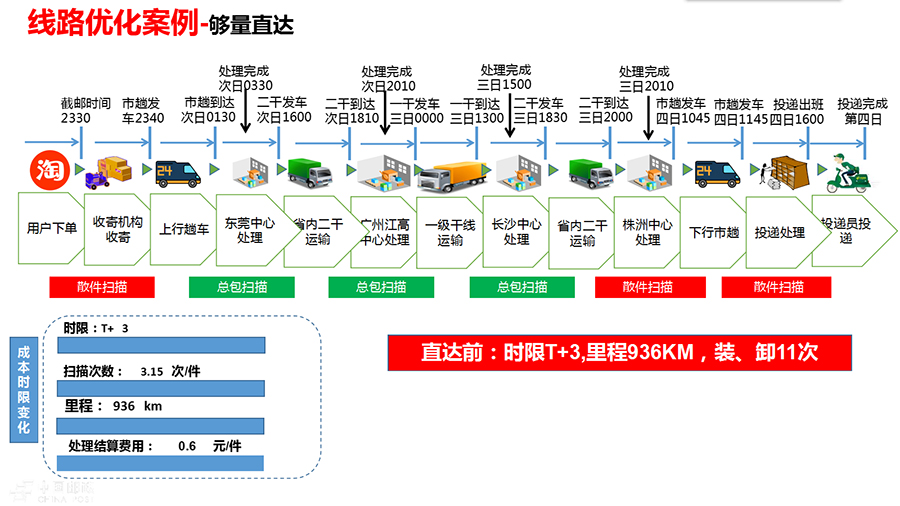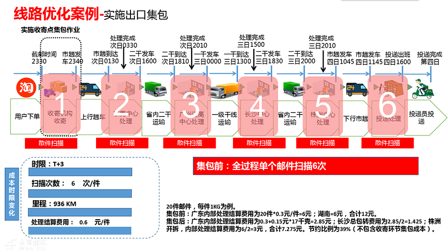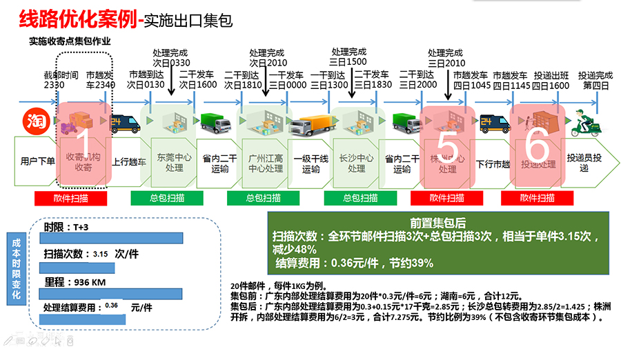 郵路要怎么捋?就是要以和競爭對手對標(biāo)為任務(wù),對每條線路從收寄到投遞進(jìn)行全環(huán)節(jié)梳理、全鏈路優(yōu)化。以廣東東莞—湖南株洲線路為例:這條線路目前日均包件量1000件,在全散件模式下,由于沒有直達(dá)郵路,郵件從收寄到投遞,每個(gè)郵件全程需經(jīng)過6次散件分揀,11次散件裝卸搬運(yùn),時(shí)限T+3。通過全環(huán)節(jié)捋、全流程捋、各環(huán)節(jié)優(yōu)化,改為在東莞實(shí)施前置集包,散件在收寄網(wǎng)點(diǎn)直接分揀封入株洲總包,同時(shí)開通東莞—株洲直達(dá)郵路,郵件由原來在東莞—廣州—長沙—株洲間散件裝卸,優(yōu)化為東莞—株洲總包裝卸。通過這兩種優(yōu)化措施的結(jié)合,郵件由散件分揀6次、裝卸搬運(yùn)11次,將變?yōu)樯⒓謷?次、總包分撥3次、裝卸搬運(yùn)7次,減少了廣州和長沙的4次總包裝卸作業(yè),處理結(jié)算費(fèi)用降低39%,裝卸效率大幅提升;時(shí)限水平由T+3將減少為T+1,達(dá)到次日遞,超過主要競爭對手;全程運(yùn)輸里程從936公里將縮短為720公里,減少了23%,節(jié)約了運(yùn)輸成本。此外,在該線路日均郵件量較少的情況下,可以采取組開深圳—東莞—株洲串行直達(dá)的運(yùn)輸方式,在提高車輛裝載率的同時(shí),實(shí)現(xiàn)當(dāng)天收寄的東莞—株洲郵件和18點(diǎn)前收寄的深圳—株洲郵件全程時(shí)限T+1。