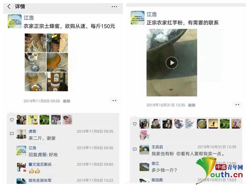 全縣23個鄉(xiāng)鎮(zhèn)的土豬、土雞、蜂蜜、葛根粉、干菜等土特產(chǎn)在他的朋友圈“輪番出售”。“農(nóng)家正宗土蜂蜜,預(yù)購從速,每斤150元。”今年“雙11”之前,江浩在朋友圈“賣貨”,不一會兒便有買家留言,“來二斤,謝謝!”