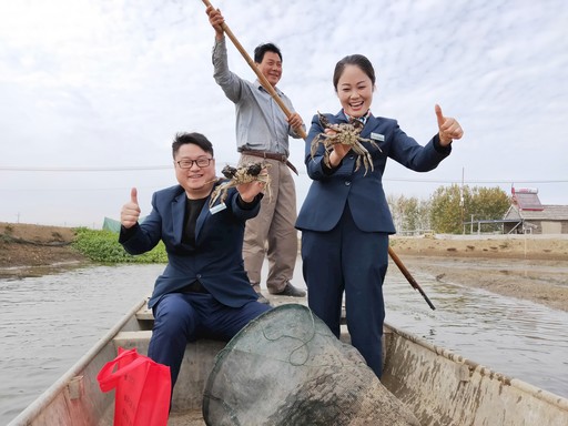 “王哥呢?”“他在場上曬稻子。”“走,去你家蟹塘看看。”還在曬糧食的王成廣接到唐傳美的電話,特意趕到螃蟹塘。他劃起船,撐起篙,載著陳仕珍和趙旭陽體驗他家水肥蟹美的收獲季。“陳局長,我給你們拉一籠上來看看。”“哎呀,大螃蟹。來來來,幫我拍個視頻,我要把老哥的螃蟹曬到抖音上去。”豐收季,郵政人比糧農蟹戶們更開心。