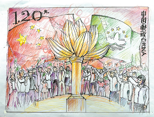 問及同為韓秉華設計的《澳門回歸祖國二十周年》與兩年前的《香港回歸祖國二十周年》郵票有什么變化,他表示:“整體風格差不多,只是構圖不一樣,澳門回歸的相對復雜一些,光是畫面中的人物就多了不少,場面顯得更為熱鬧?!?/p>