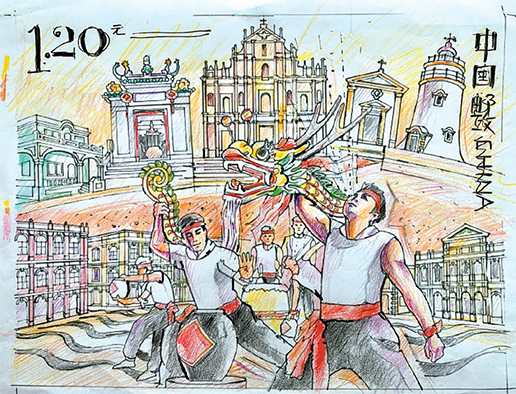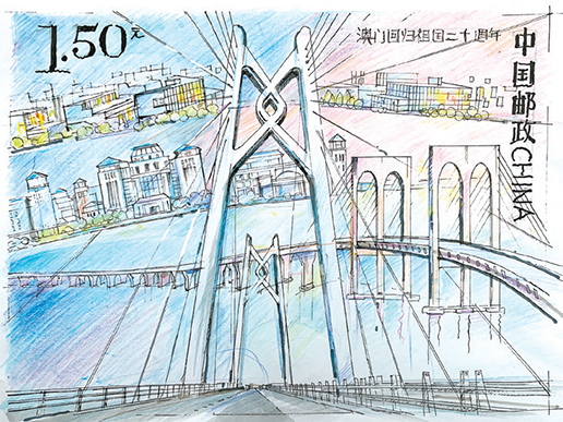 “《澳門回歸祖國二十周年》與《粵港澳大灣區》兩套郵票是今年5月同時約稿的,設計也是穿插進行,因為我對澳門感受更為深刻,加之這套郵票的內容相對集中,所以設計比較順利,在《粵港澳大灣區》郵票完成三周后就提交了這套郵票的圖稿。”韓秉華饒有興致地回憶道。