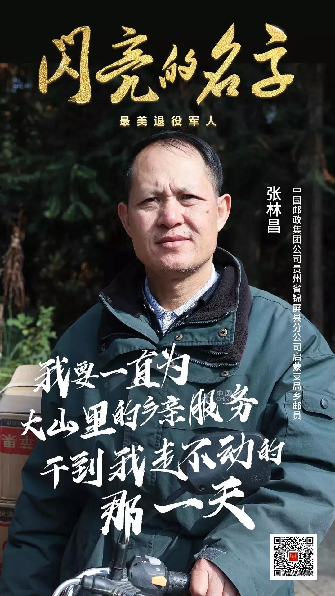 張林昌1983年入伍,1987年退役后主動申請到全縣最難走的郵路送信送報,32年來堅持為偏居一隅的苗族侗族同胞投遞報刊、郵件140多萬件,在大山里跋涉超過24萬公里,相當于走了19次“二萬五千里長征”;他義務為山區群眾代購農作物良種、生活用品,代取款,被群眾稱為“鄉郵路上的天使”和“九十九道拐上的綠色使者”。他曾獲全國勞動模范、第四批全國崗位學雷鋒標兵、中國好人、全國模范退役軍人等稱號。
