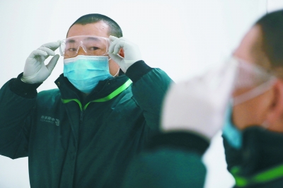 出發前,侯毅在衣冠鏡前整理著裝并檢查自己的個人防護裝備是否佩戴到位。