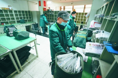 早上7點,侯毅已到崗,按順序整理好要送的報紙、信件,一個大郵包被塞得滿滿的。出發前,他先給訂戶打電話,有人會到門口來取,有人會讓他放到門衛處,還有人會讓他放到小區統一的暫存點。哪個用戶是什么習慣,他都熟稔于心。臨走,侯毅戴上塑膠手套、護目鏡,全身消毒,兜里隨時揣著一瓶消毒凝膠。
