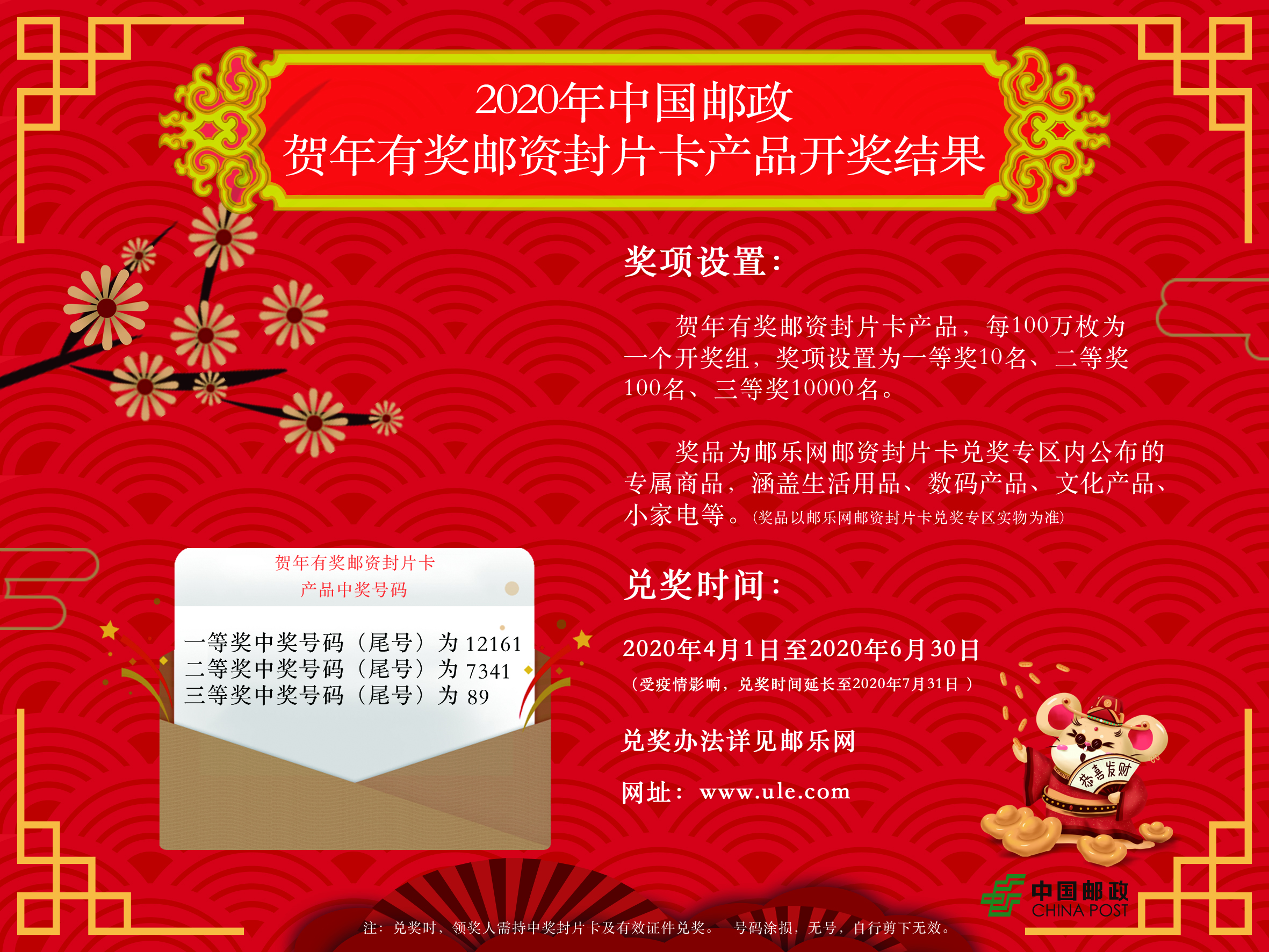 2020年賀年有獎郵資封片卡中獎號碼于3月18日產(chǎn)生。現(xiàn)將具體中獎信息通知如下: