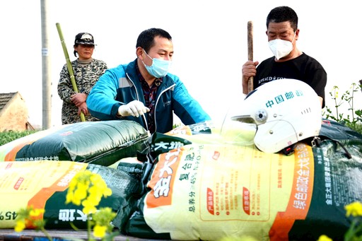江蘇省射陽縣郵政分公司開展“戰疫情、搶農時、郵我助,郵農一心保春耕“活動,基層員工利用班前班后時間將農民需要的復合肥配送到農民家門口、田間地頭,并組織志愿者協助缺勞力戶為莊稼施肥鋤草。截至3月17日,該分公司已向全縣農民配送復合肥546噸,幫助17戶缺勞力戶解除農活上的后顧之憂。圖為通洋支局投遞員將肥料送到農戶地頭?!鮿⒌铝?nbsp; 攝影報道