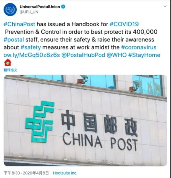 4月9日,萬國郵政聯(lián)盟在其官方社交媒體上發(fā)布了由中國郵政集團(tuán)有限公司制作的《新冠病毒防護(hù)指導(dǎo)手冊》英文版,向世界分享中國郵政的疫情防控經(jīng)驗(yàn)。