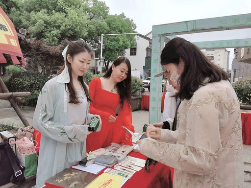 5月30日下午,為配合集市主題,集郵與文化傳媒部的工作人員早已換好漢服,梳著仿古發髻,在顯著攤位上擺放好了一應產品。
