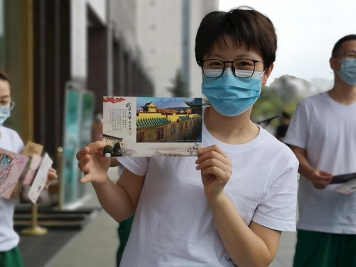 3月26日下午,人民日報社新媒體中心、武漢市郵政分公司、武漢武昌區疫情防控指揮部共同舉辦“同舟共濟 感恩有您”為援漢醫療隊贈禮活動,醫療隊員們對武漢風光明信片愛不釋手。圖為醫療隊員展示自己最喜歡的武漢大學風光明信片。□李漢梅 攝