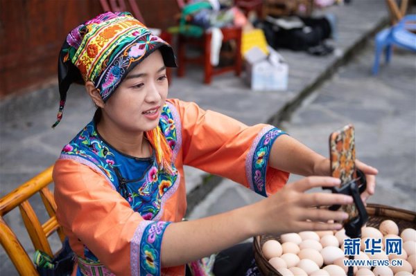 在湘西十八洞村,施林嬌在直播開始前調(diào)整手機(7月3日攝)。 新華社記者 陳思汗 攝