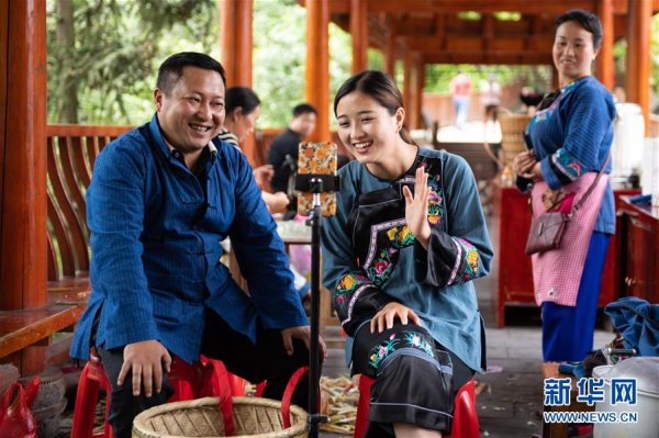 在湘西十八洞村,十八洞村扶貧隊長麻輝煌(左)與返鄉(xiāng)大學生施林嬌(中)一起直播推銷土特產(chǎn)(5月15日攝)。 新華社記者 陳思汗 攝