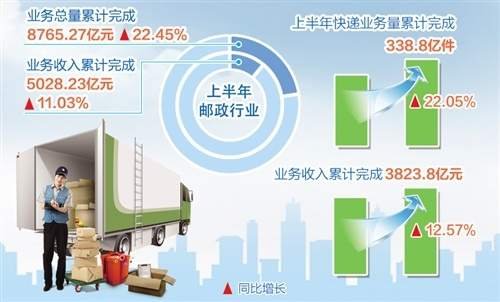 國家郵政局統計數據顯示,上半年,郵政快遞業逐漸擺脫新冠肺炎疫情影響逆勢上揚,主要經濟指標超過去年同期水平。1月至6月,郵政行業業務總量累計完成8765.27億元,同比增長22.45%;業務收入(不包括郵政儲蓄銀行直接營業收入)累計完成5028.23億元,增長11.03%。其中,快遞業務量完成338.8億件,增長22.05%,超過2016年全年(312.8億件);快遞業務收入完成3823.8億元,增長12.57%。