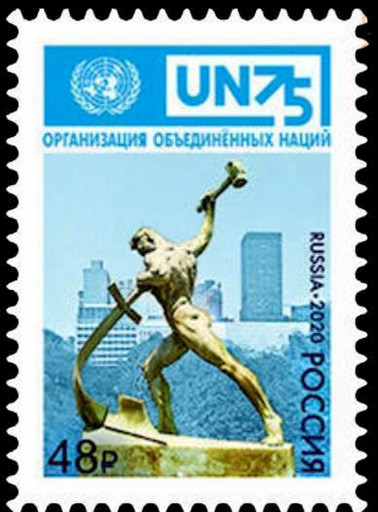 5月22日,俄羅斯郵政發(fā)行1枚郵票紀(jì)念聯(lián)合國成立75周年。郵票圖案為雕塑《鑄劍為犁》,這是蘇聯(lián)于1957年送給聯(lián)合國的禮物,并于1958年布魯塞爾國際博覽會上榮獲大獎,是著名雕塑大師烏切吉奇的名作之一,代表了世界各國人民千百年來渴望和平的美好愿望。6月4日,德國郵政發(fā)行1枚郵票,慶賀聯(lián)合國建立75周年。