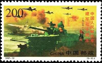 1997年8月1日,中國郵政發(fā)行了1997-12《中國人民解放軍建軍七十周年》紀念郵票1套5枚,票名分別是“陸軍”“海軍”“空軍”“戰(zhàn)略導彈部隊”和“陸海空聯(lián)合演習”5枚郵票,以陸、海、空和戰(zhàn)略導彈部隊的主戰(zhàn)兵器為主圖,背景是按兵種按時間有機串聯(lián)在一條主線上的建軍七十年來的重大事件,淡彩的背景與重彩的主圖珠聯(lián)璧合,能夠讓人自然重溫人民解放軍七十年的成長歷程,真切感受人民軍隊的現(xiàn)代化步伐。每幅畫面雖沒有出現(xiàn)一個軍人形象,但那隆隆開進的坦克、劈波斬浪的軍艦、呼嘯而過的戰(zhàn)機和騰空而起的導彈,創(chuàng)造了一種千軍萬馬奔騰向前的氣勢,表現(xiàn)出現(xiàn)代化戰(zhàn)爭操縱著現(xiàn)代武器與敵人決戰(zhàn)千里之外的新特點,收到了此處無人勝有人的藝術效果。
