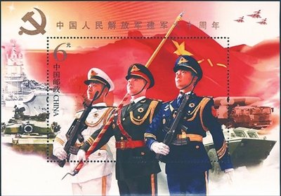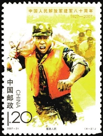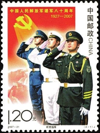 2007年8月1日發(fā)行2007-21《中國人民解放軍建軍八十周年》紀念郵票1套4枚,畫面生動表現(xiàn)了中國人民解放軍在黨的領導下,發(fā)揚聽黨指揮、服務人民、英勇善戰(zhàn)的優(yōu)良傳統(tǒng),刻苦訓練、抗洪搶險,參與聯(lián)合國維和行動,用忠誠和熱血捍衛(wèi)國家主權(quán)和安全,筑起共和國的鋼鐵長城,集中反映出軍隊建設的新成就和我軍忠實履行歷史使命的時代風采。