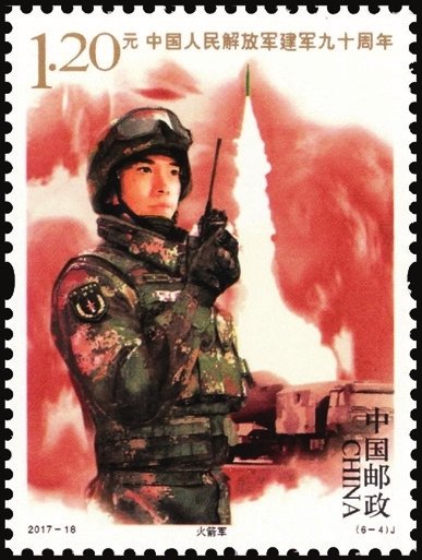 2017年8月1日中國郵政發(fā)行了2017-18《中國人民解放軍建軍九十周年》紀念郵票1套6枚,小型張1枚。圖案內(nèi)容分別為:陸軍、海軍、空軍、火箭軍、戰(zhàn)略支援部隊、武裝警察部隊,小型張內(nèi)容為聽黨指揮。該套郵票展現(xiàn)了中國人民解放軍的颯爽英姿和中國軍事作戰(zhàn)裝備的硬件實力,主題鮮明,磅礴大氣,畫面具有強烈的動感和威嚴的氣勢。小型張上軍旗飄揚,各軍種英姿颯爽,背景襯托各軍種高尖端裝備,描繪了我軍戰(zhàn)士聯(lián)合作戰(zhàn)的畫面,既表現(xiàn)了中國人民解放軍威武雄壯的軍容和現(xiàn)代化水平,也體現(xiàn)出黨的十八大以來,人民軍隊在新時代強軍目標指引下所取得的巨大成就。