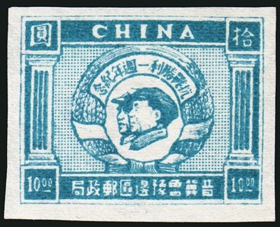 2.抗戰勝利后,各根據地陸續發行了抗戰勝利紀念郵票。晉察冀邊區于1945年到1946年發行的該題材郵票主圖為“八路健兒疆場殺敵圖”,并且以此圖案發行過兩次郵票,根據票幅大小不同分別稱作“抗戰勝利紀念大型郵票”(俗稱“大抗戰”)和“抗戰勝利紀念小型郵票”(俗稱“小抗戰”)。晉冀魯豫邊區分別于1947年3月和7月發行了“抗戰勝利一周年紀念郵票”和“抗戰勝利二周年紀念郵票”,兩套郵票主圖相同,顏色不同,均為毛澤東主席和朱德總司令的側面像,這是抗戰期間指揮邊區軍民抗擊日寇的兩位領袖。東北區1947年發行了三種紀念抗戰的郵票,7月7日發行的“七七”抗戰十周年紀念郵票及小全張,主圖為一只有力的手臂緊握一支步槍,表示面對敵人的侵略,全民抗戰的決心;8月15日發行的“八一五”東北解放二周年紀念郵票,主圖為陽光照射下的白山黑水,兩側為大豆、高粱,表現解放后的東北豐衣足食,生活美好;9月18日發行的“九一八”紀念郵票,主圖為東三省地圖,兩側分別為“反對美蔣反動派制造二次滿洲國”的文字,在紀念“九一八”事變的同時,也宣傳了當時的斗爭形式。山東區發行的“抗日民族戰爭勝利紀念郵票”,主圖是毛澤東揮手指引人民奔向光明的前程,表示勝利后,人民希望建立一個富強民主的新中國的美好愿望。東北區還于1949年8月15日發行了“八一五”四周年紀念郵票,主圖為東北抗日暨愛國自衛戰爭烈士紀念塔。1946年12月,山東區發行了“膠東抗日烈士紀念塔圖郵票”,主圖為紀念塔,緬懷膠東抗戰中犧牲的烈士。