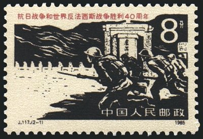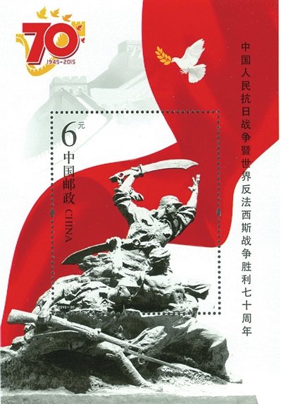3.新中國成立后發行的抗戰紀念郵票,郵票主圖取材廣泛,圖案名稱多用抗戰史實名稱來命名。1952年7月7日發行的紀16“抗日戰爭十五周年紀念”郵票,分別為“盧溝橋風云”“平型關勝利”“歡送新四軍抗日”“領袖策劃反攻”,4枚郵票圖案定格抗戰中4個有代表性的場景。1965年9月3日發行的紀115“紀念抗日戰爭勝利二十周年”郵票,1套4枚,“毛主席在著作”一圖描繪了毛澤東在延安窯洞里寫作《論持久戰》的情景;“八路軍東渡黃河”郵票圖案為八路軍戰士在黃河邊準備東渡,奔赴抗日戰爭前線的場面;“人民戰爭勝利”主圖為取得抗日戰爭勝利的八路軍、新四軍和游擊隊戰士在歡呼勝利的場景;“光榮參軍”主圖為人民群眾積極參加人民軍隊,加入抗戰隊伍的情景。1985年9月3日發行的J.117“抗日戰爭和世界反法西斯戰爭勝利40周年”郵票,1套2枚,“盧溝橋中國軍隊奮起抗日”描繪了抗日戰爭中國民黨二十九軍將士沖鋒陷陣、奮勇抗戰的英雄形象;“八路軍和民兵戰斗在長城內外”展現了八路軍配合民兵浴血奮戰,共同打擊日寇的光輝形象。1995年9月3日發行的“抗日戰爭和世界反法西斯戰爭勝利五十周年”郵票,1套8枚,分別為“戰火”“臺兒莊大捷”“百團大戰”“敵后游擊戰”“芒友會師”“華僑捐獻”“臺灣光復”“偉大勝利”。分別描繪了盧溝橋戰斗、臺兒莊大捷、百團大戰、敵后游擊戰、芒友會師的場景,以及華僑捐獻、歡慶臺灣光復、日本正式投降簽字儀式的勝利場面。2005年8月15日發行的“中國人民抗日戰爭暨世界反法西斯戰爭勝利六十周年”郵票,1套4枚及1枚小型張,“全民抗戰”展現的是國共兩黨軍隊和人民群眾并肩作戰的場面;“中流砥柱”主圖為一名八路軍戰士吹響沖鋒號,展現了八路軍在抗戰中的重要作用;“諾曼底登陸”主圖為登陸后手持步槍的美軍士兵;“攻克柏林”主圖為蘇軍歡呼勝利的場景;小型張主圖為一只沖破鐵絲網的白色和平鴿,寓意和平與正義沖破了戰爭的主題。2015年9月3日發行的“中國人民抗日戰爭暨世界反法西斯戰爭勝利七十周年”郵票,1套13枚及1枚小型張,郵票圖案背景表現的是中國抗戰中的13個經典事件場面,主圖是與該事件相關的紀念場館:“九一八”歷史博物館、東北烈士紀念館、中國人民抗日戰爭紀念館、上海淞滬抗戰紀念館、侵華日軍南京大屠殺遇難同胞紀念館、臺兒莊大戰紀念館、延安革命紀念館、八路軍總部舊址紀念館、百團大戰紀念館、平型關大捷紀念館、冉莊地道戰紀念館、新四軍紀念館、滇西抗戰紀念館;小型張畫面以《大刀進行曲》雕塑為主圖,高度概括、反映了全民抗戰的主題。