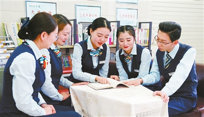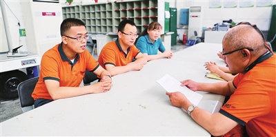 葛軍(右)與伙伴們一起學習、研討業(yè)務。