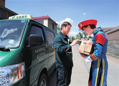 互助土族自治縣郵政分公司投遞員學習踐行“鴻雁天路”精神,圖為投遞員為南門峽鎮(zhèn)西坡村村民投遞包裹。