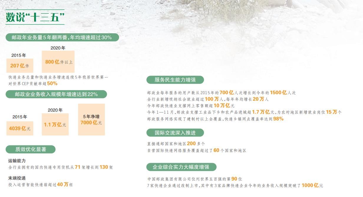 5年來,郵政業(yè)發(fā)展突飛猛進(jìn)。快遞年業(yè)務(wù)量從2015年的207億件增長到今年的800億件以上,5年翻了兩番。我國包裹快遞量超過了美國、日本、歐洲等發(fā)達(dá)經(jīng)濟(jì)體總和,對世界CEP(快遞包裹)市場貢獻(xiàn)率超過了50%。2019年,中國郵政行業(yè)業(yè)務(wù)收入累計完成9642.5億元,與此同時,城市末端智能快件箱的市場需求快速增長,農(nóng)村郵政服務(wù)網(wǎng)絡(luò)及扶貧成果引人矚目……回望“十三五”,郵政業(yè)拔節(jié)孕穗、碩果累累。坐上駛向人民美好生活的郵車,一幅幅美妙的圖景不斷閃現(xiàn)。