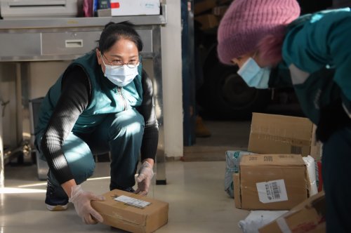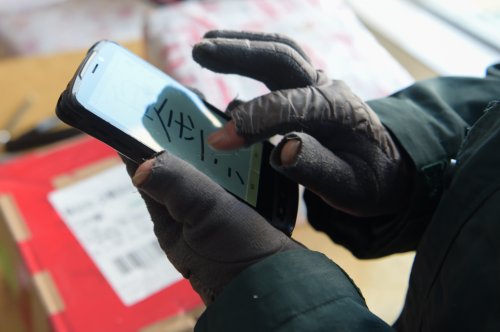 每天上午八點半,韓金花就開始工作,要一直忙碌到天黑。為了御寒,韓金花提前準備了暖足貼,外出工作時貼到腳上。她在手套的拇指與食指部分剪了洞,露出手指,方便在設(shè)備中錄入快遞信息。寒冬里,手指經(jīng)常凍得失去知覺。“今年10月份我就要退休了,我要站好最后一班崗。”她說。
