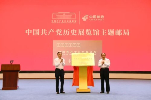 康寧和吳向東(左)為中國共產(chǎn)黨歷史展覽館主題郵局揭牌