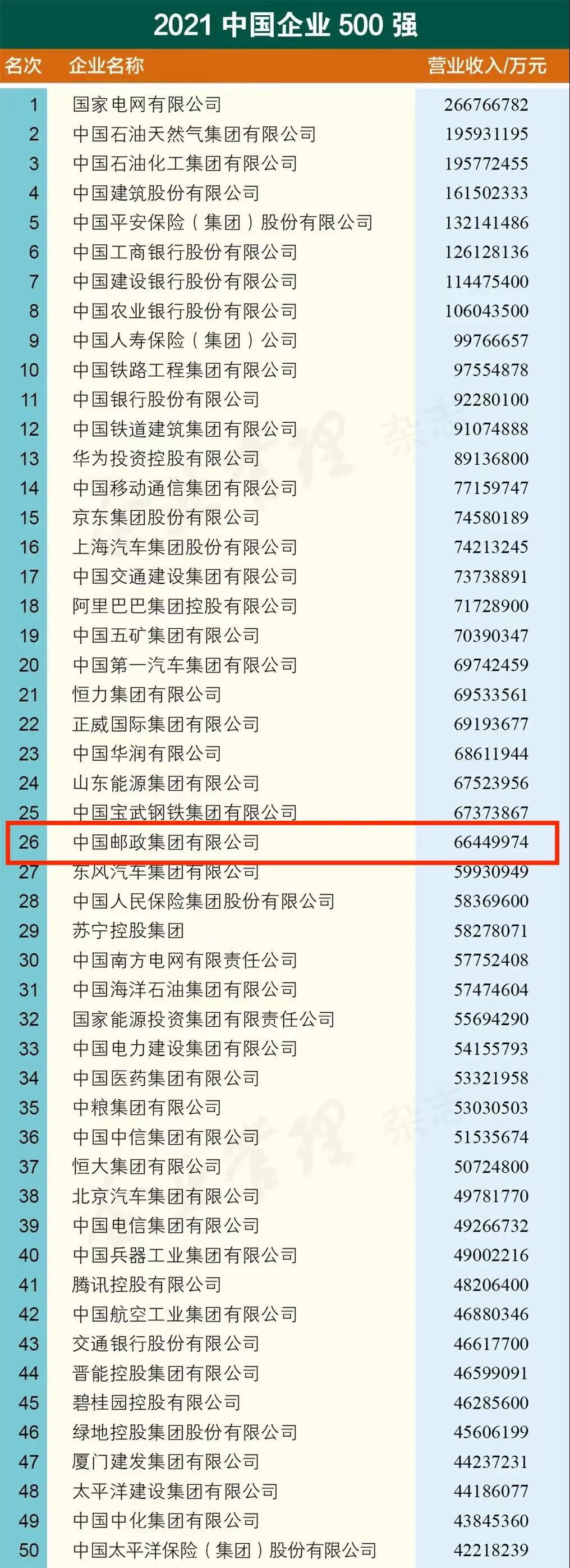 9月25日,在2021中國500強企業高峰論壇上,中國企業聯合會、中國企業家協會連續第20次向社會發布“中國企業500強”名單,中國郵政集團有限公司位列第26位。