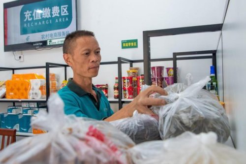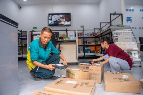 9月15日,投遞員張永洪(左)在村民家收取村民外銷的農產品。